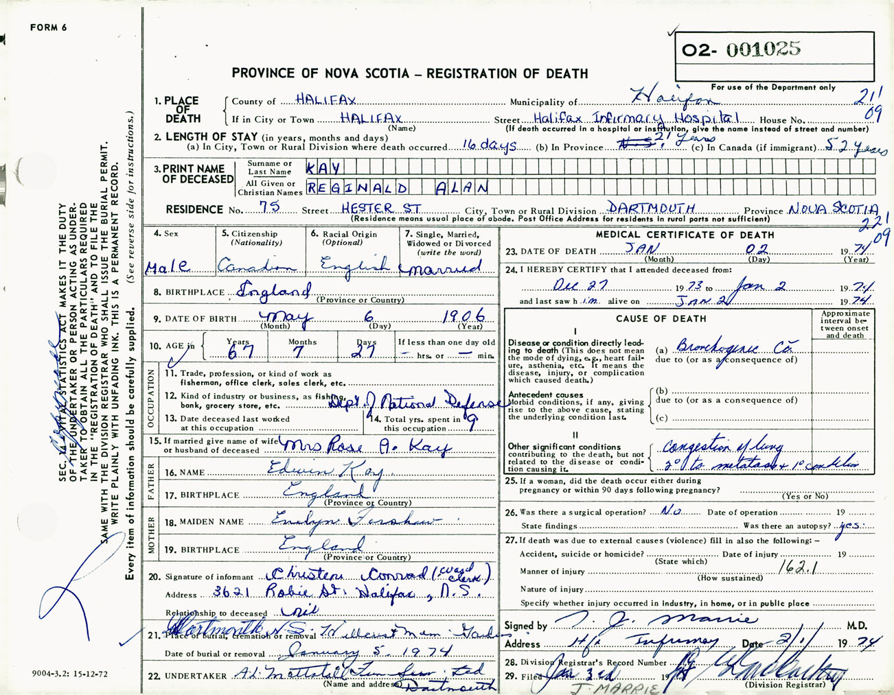 Male Death Registration: Year: 1974 number: 1025