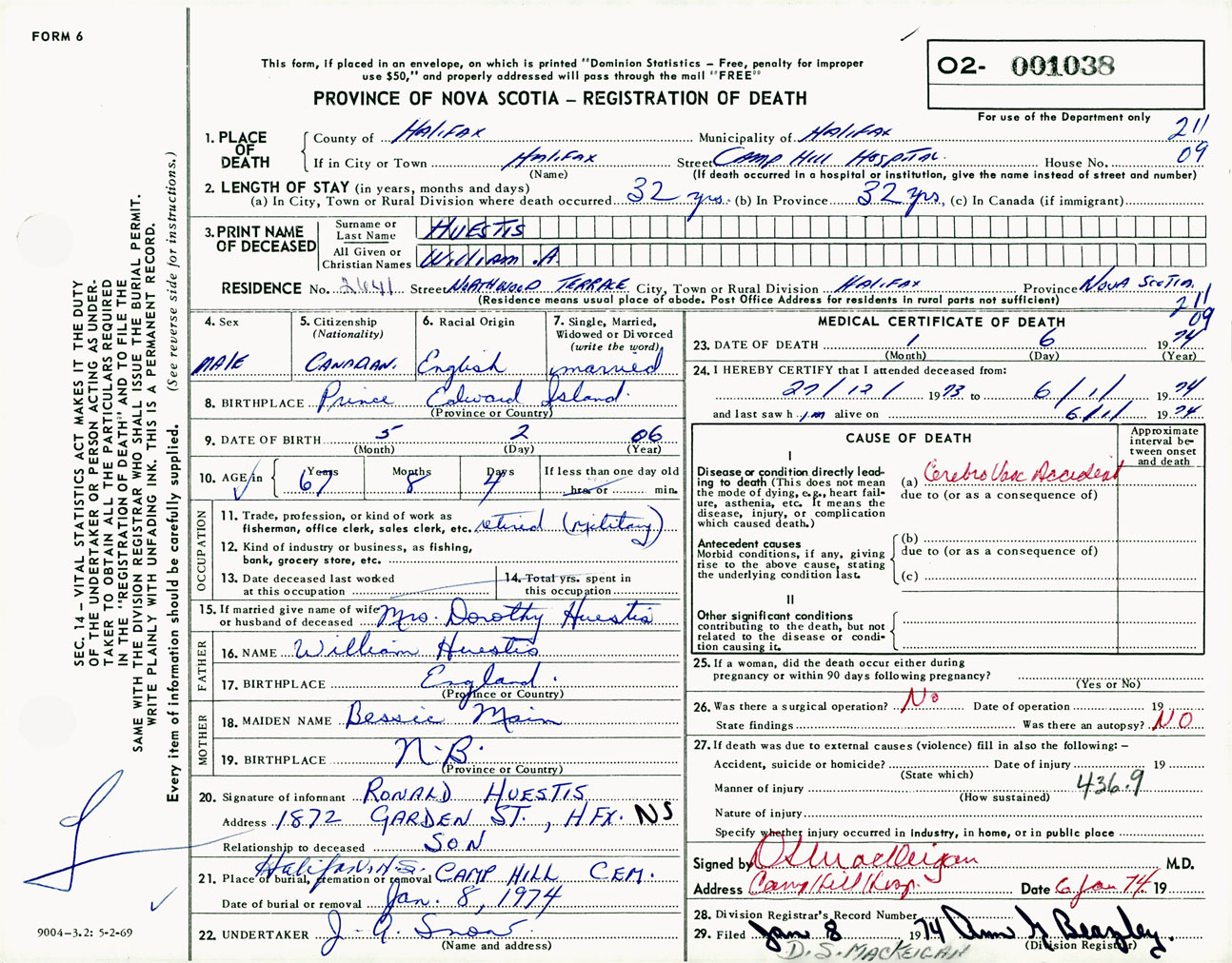 Male Death Registration: Year: 1974 number: 1038