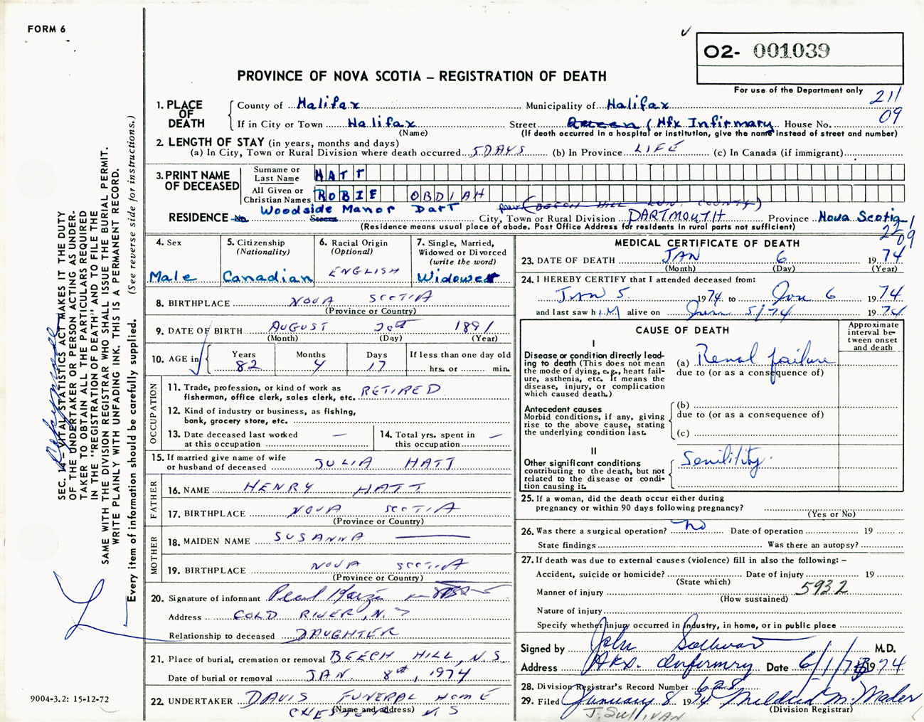 Male Death Registration: Year: 1974 number: 1039