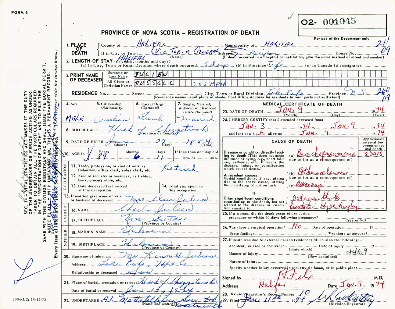 Male Death Registration: Year: 1974 number: 1045