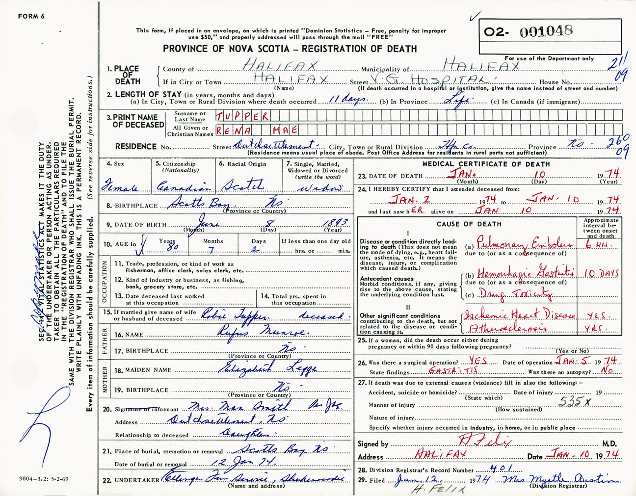 Female Death Registration: Year: 1974 number: 1048