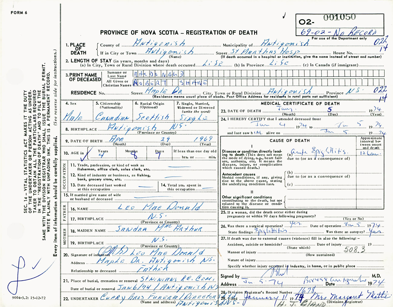 Male Death Registration: Year: 1974 number: 1050