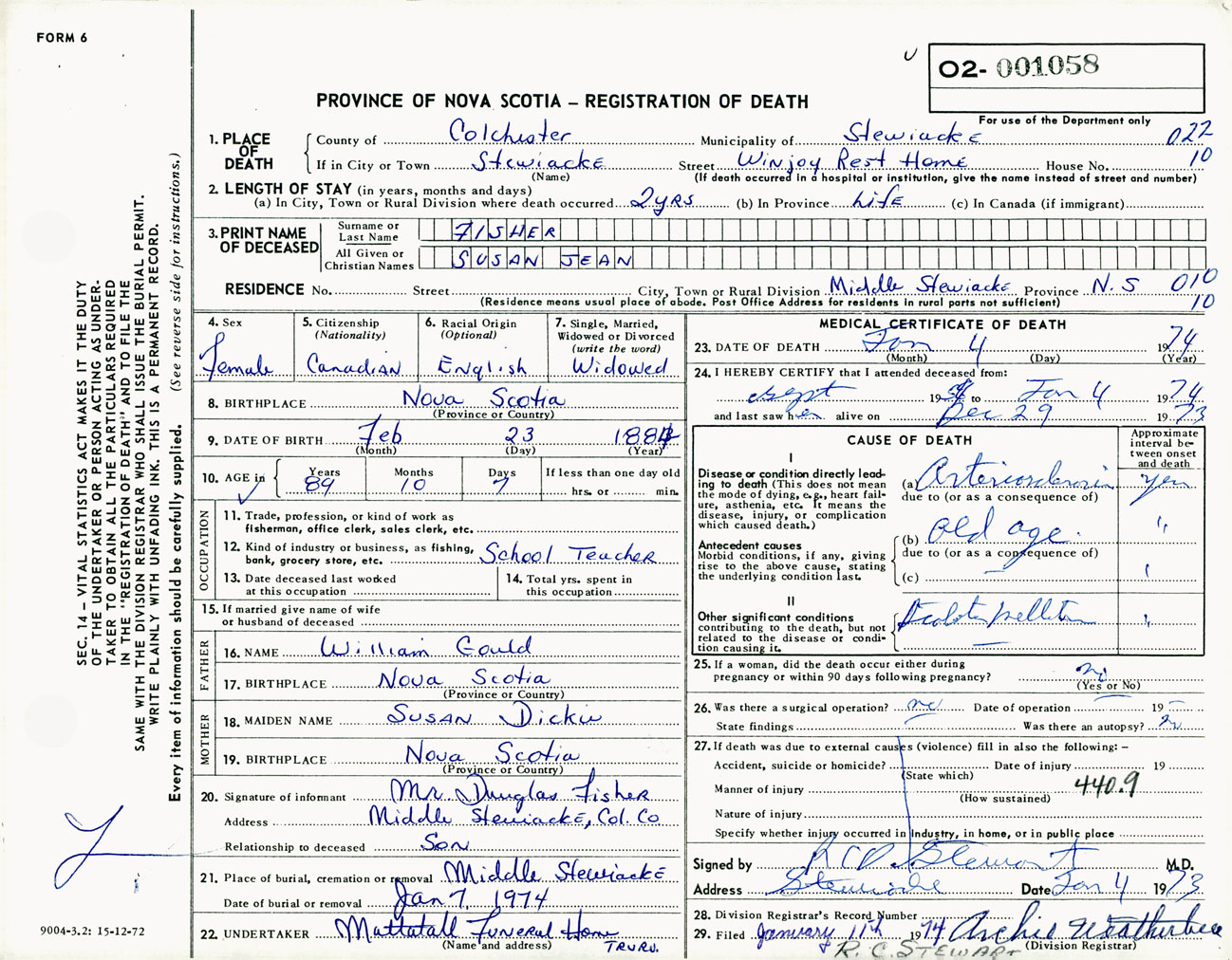 Female Death Registration: Year: 1974 number: 1058