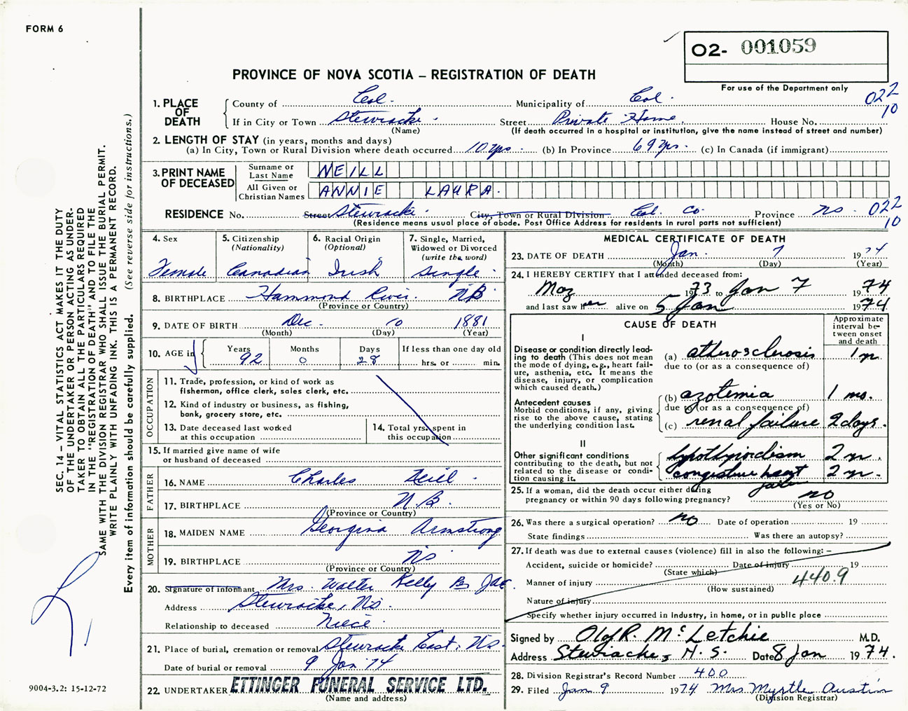 Female Death Registration: Year: 1974 number: 1059