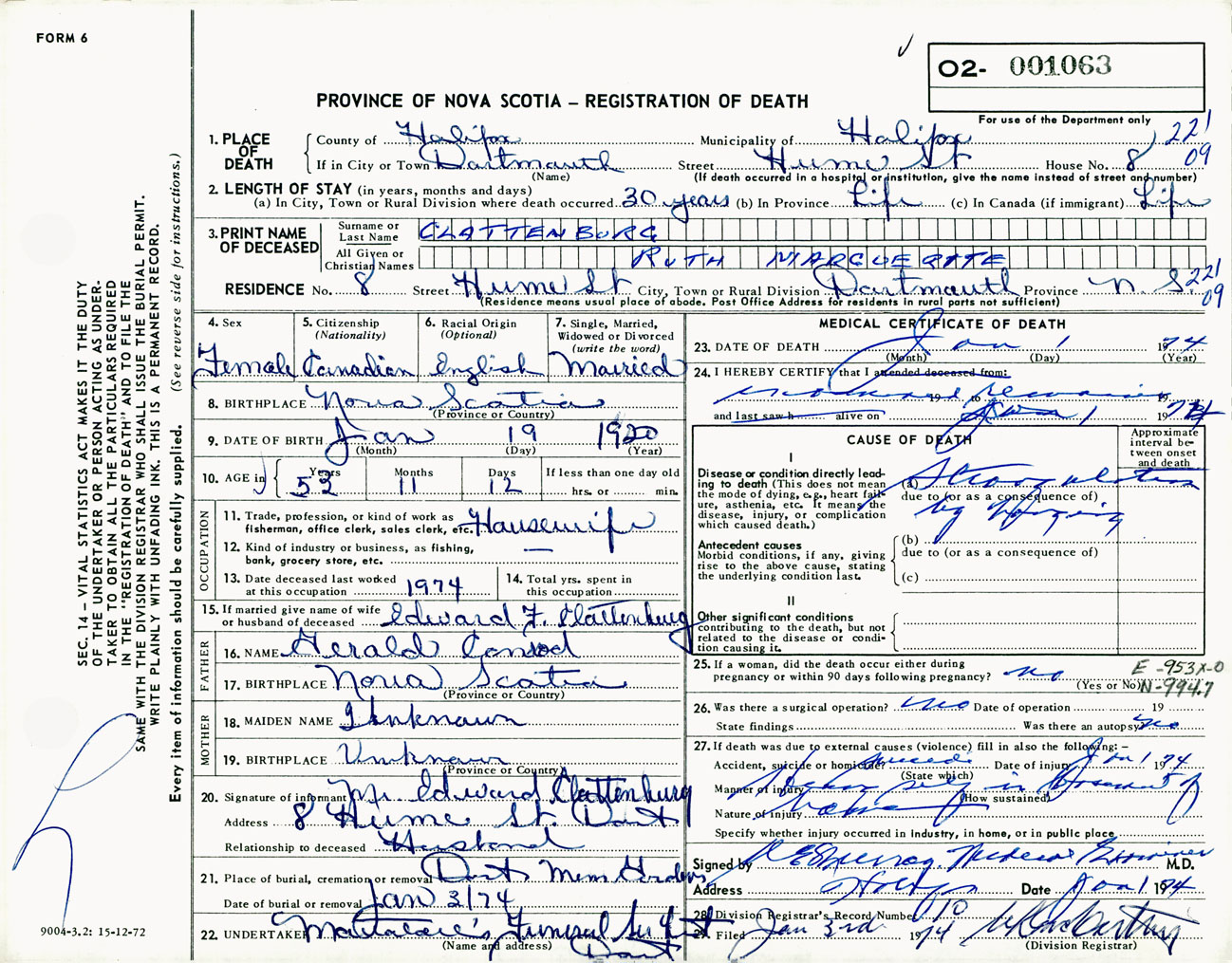 Female Death Registration: Year: 1974 number: 1063