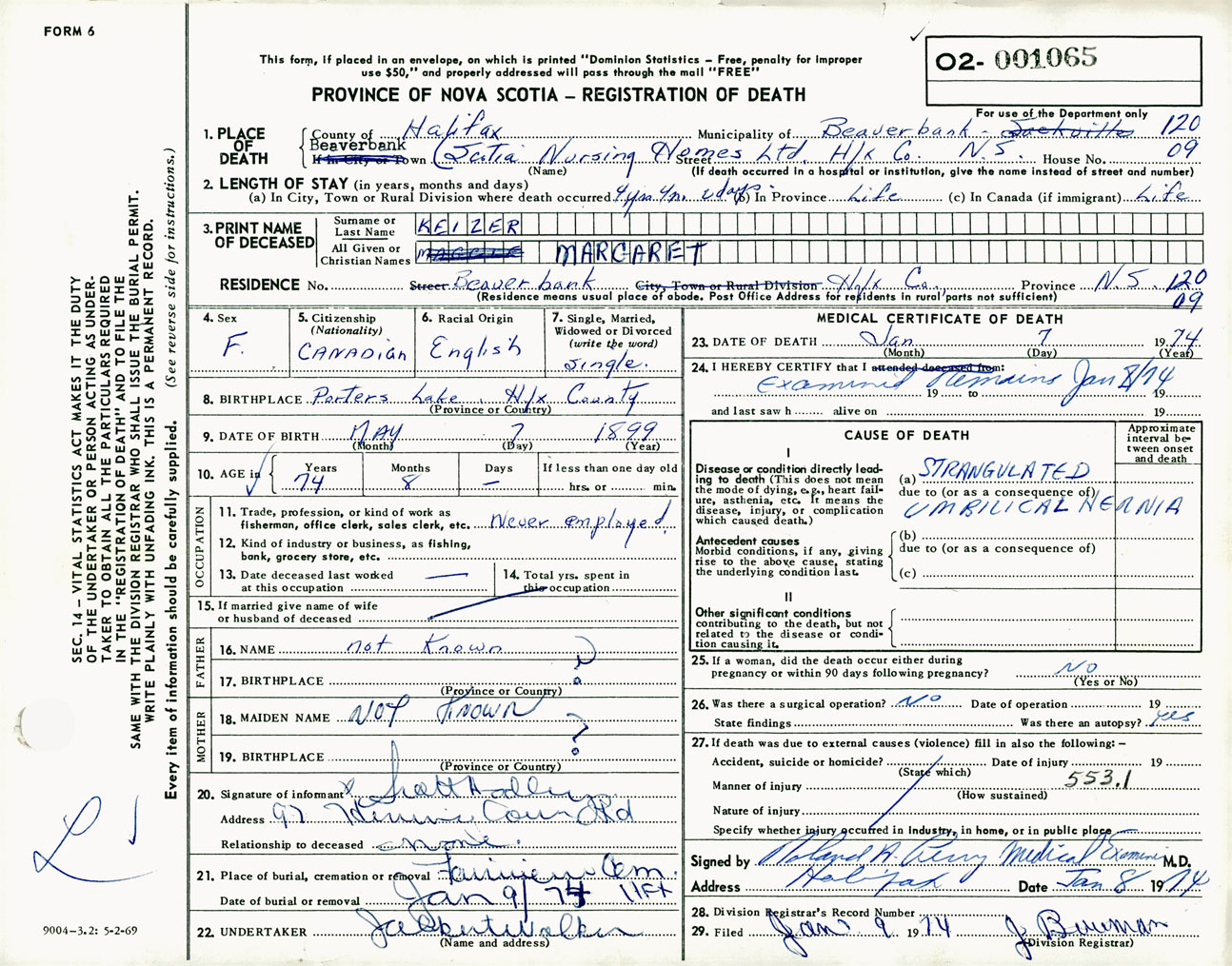 Female Death Registration: Year: 1974 number: 1065