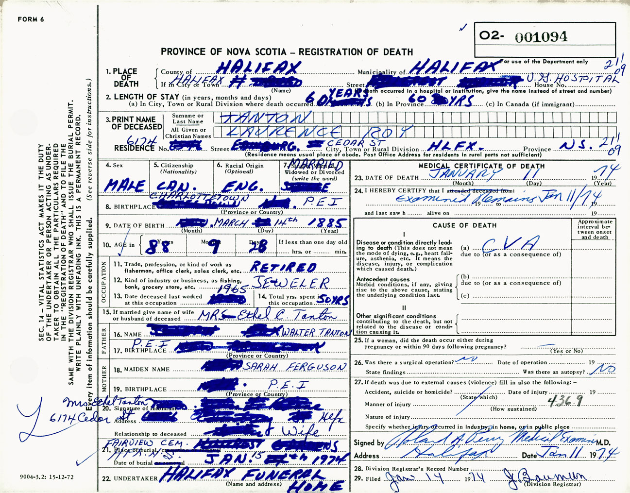 Male Death Registration: Year: 1974 number: 1094