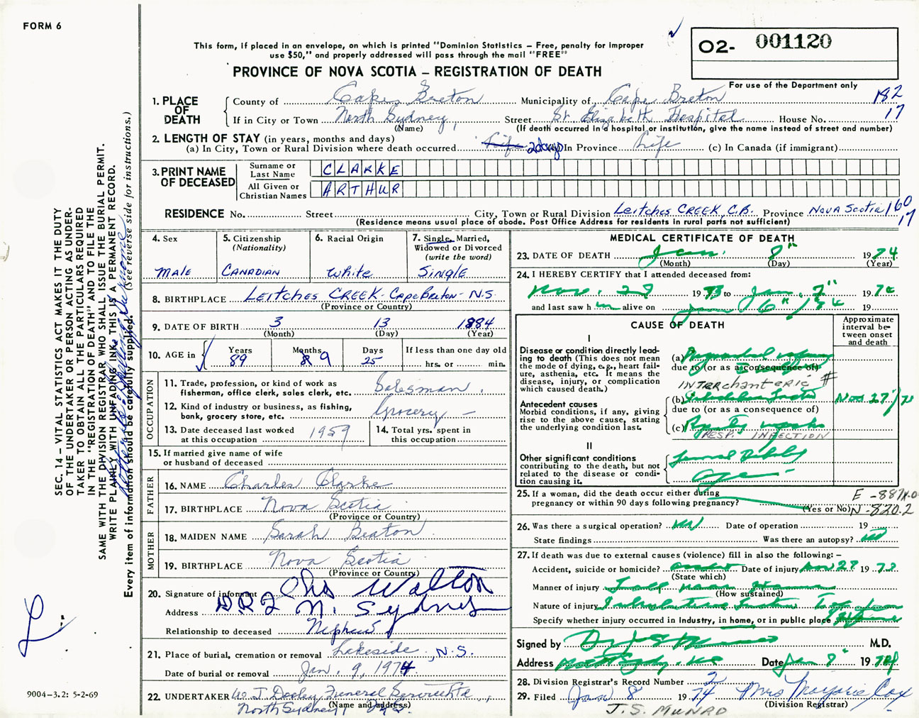 Male Death Registration: Year: 1974 number: 1120