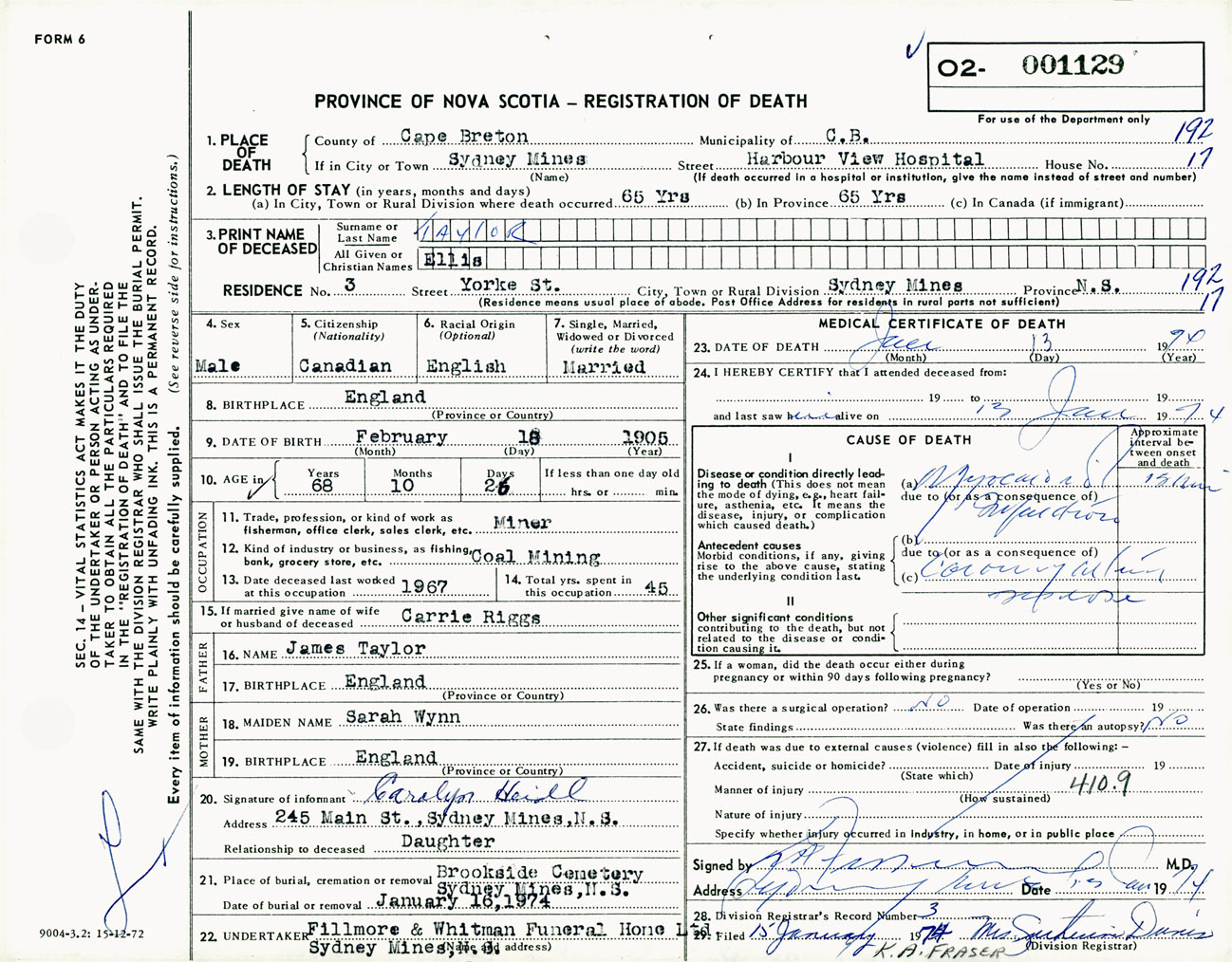 Male Death Registration: Year: 1974 number: 1129
