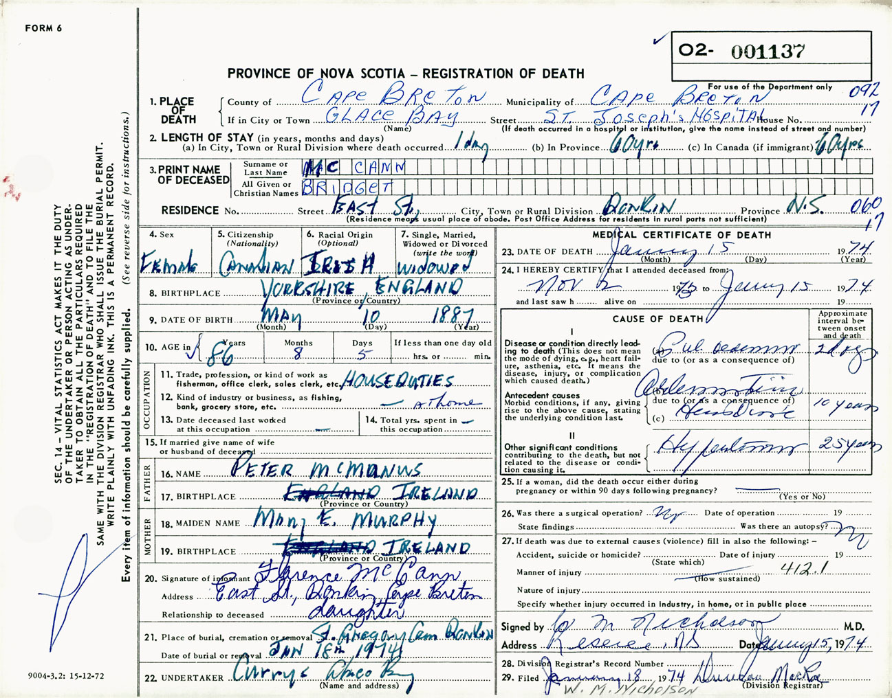 Female Death Registration: Year: 1974 number: 1137