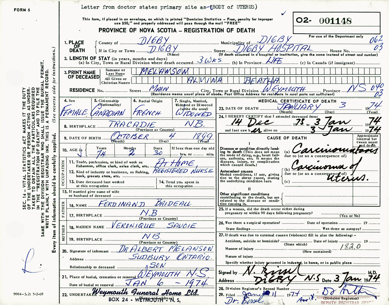Female Death Registration: Year: 1974 number: 1148