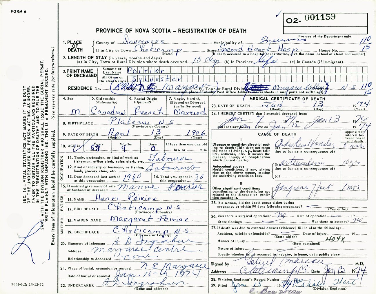Male Death Registration: Year: 1974 number: 1159