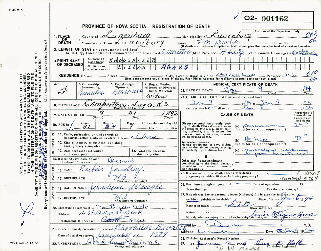Female Death Registration: Year: 1974 number: 1162