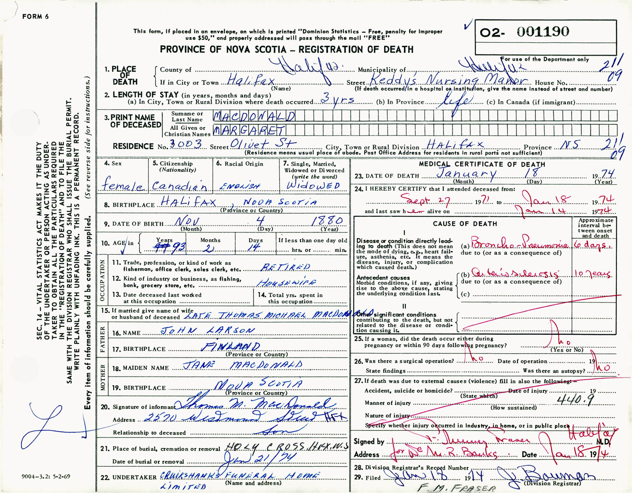 Female Death Registration: Year: 1974 number: 1190