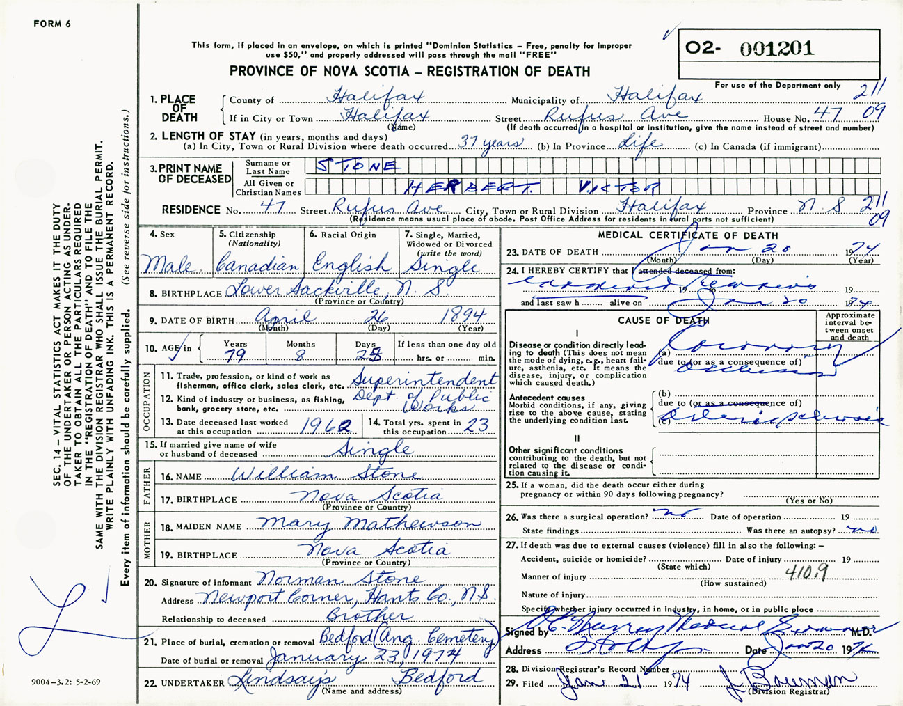 Male Death Registration: Year: 1974 number: 1201