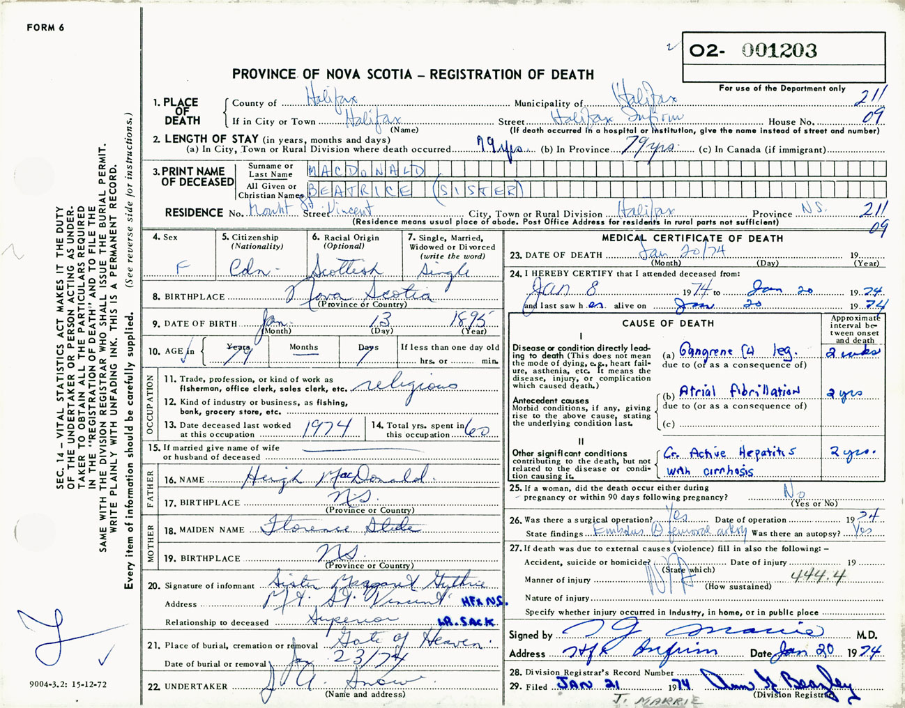 Female Death Registration: Year: 1974 number: 1203