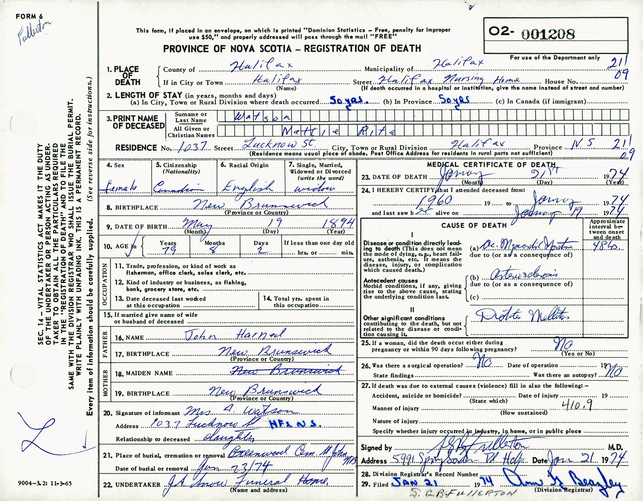 Female Death Registration: Year: 1974 number: 1208