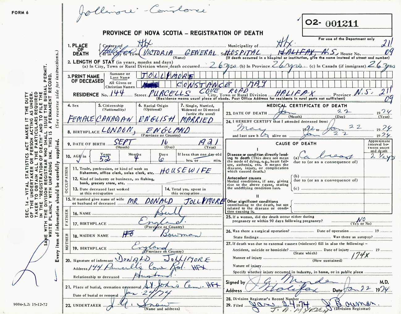 Female Death Registration: Year: 1974 number: 1211