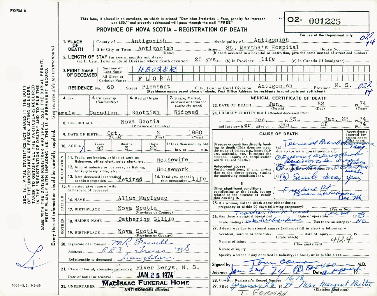 Female Death Registration: Year: 1974 number: 1225