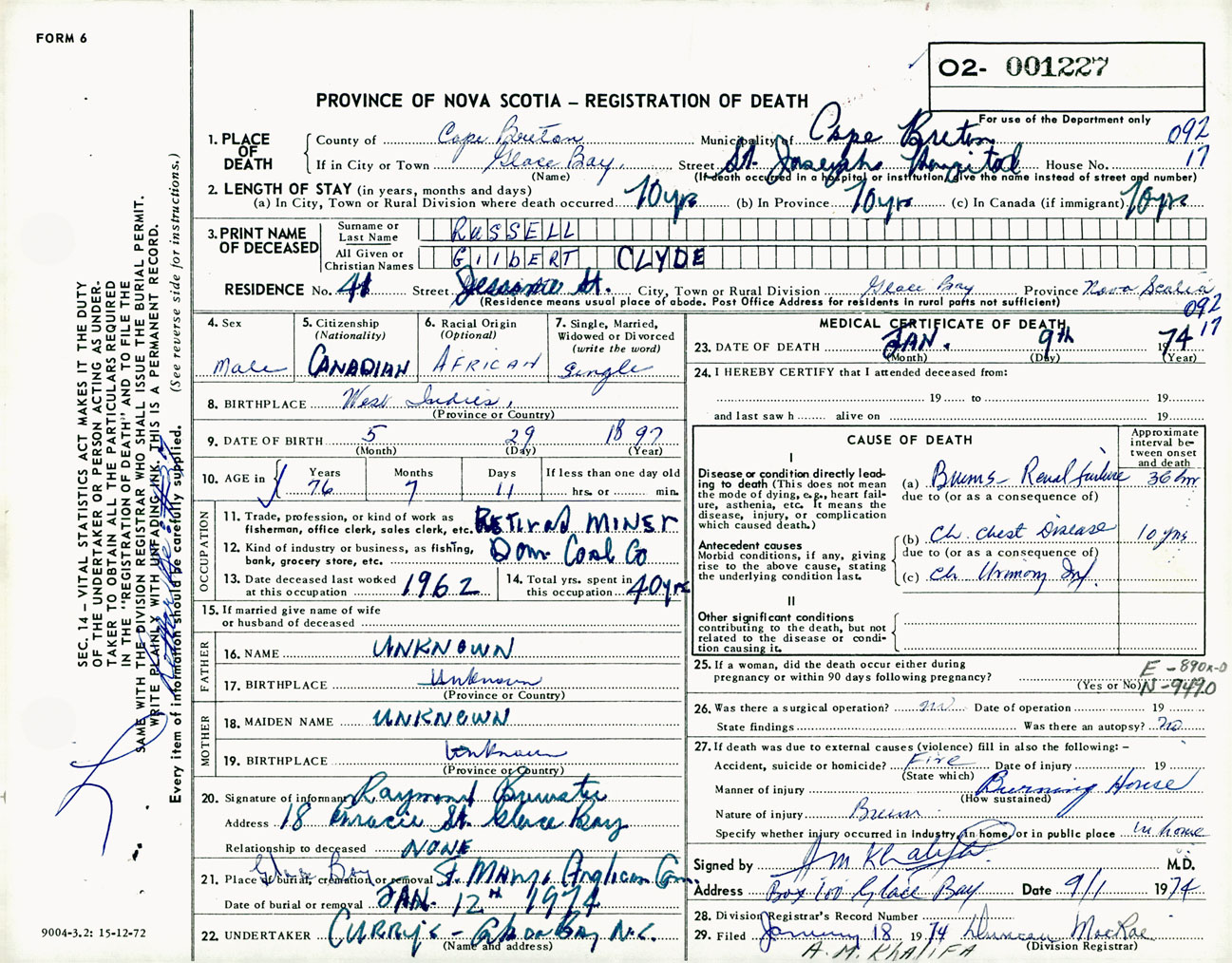 Male Death Registration: Year: 1974 number: 1227