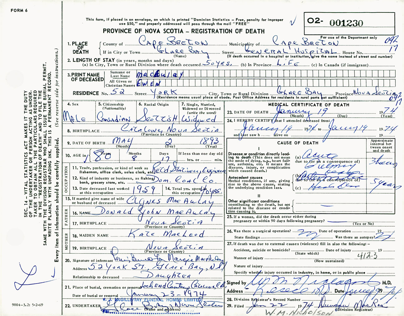 Male Death Registration: Year: 1974 number: 1230