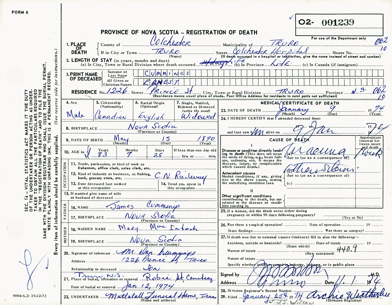 Male Death Registration: Year: 1974 number: 1239