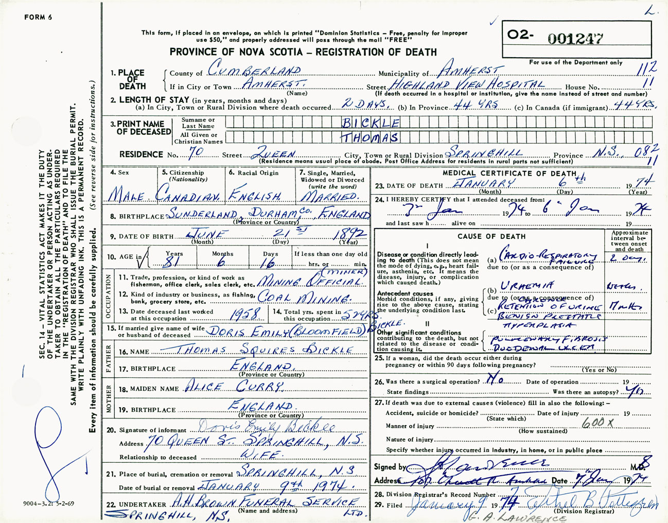 Male Death Registration: Year: 1974 number: 1247