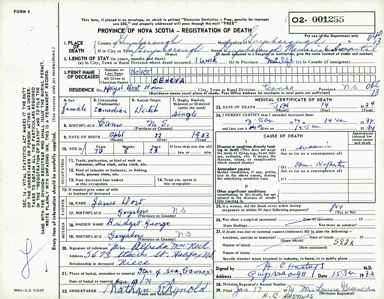 Female Death Registration: Year: 1974 number: 1255
