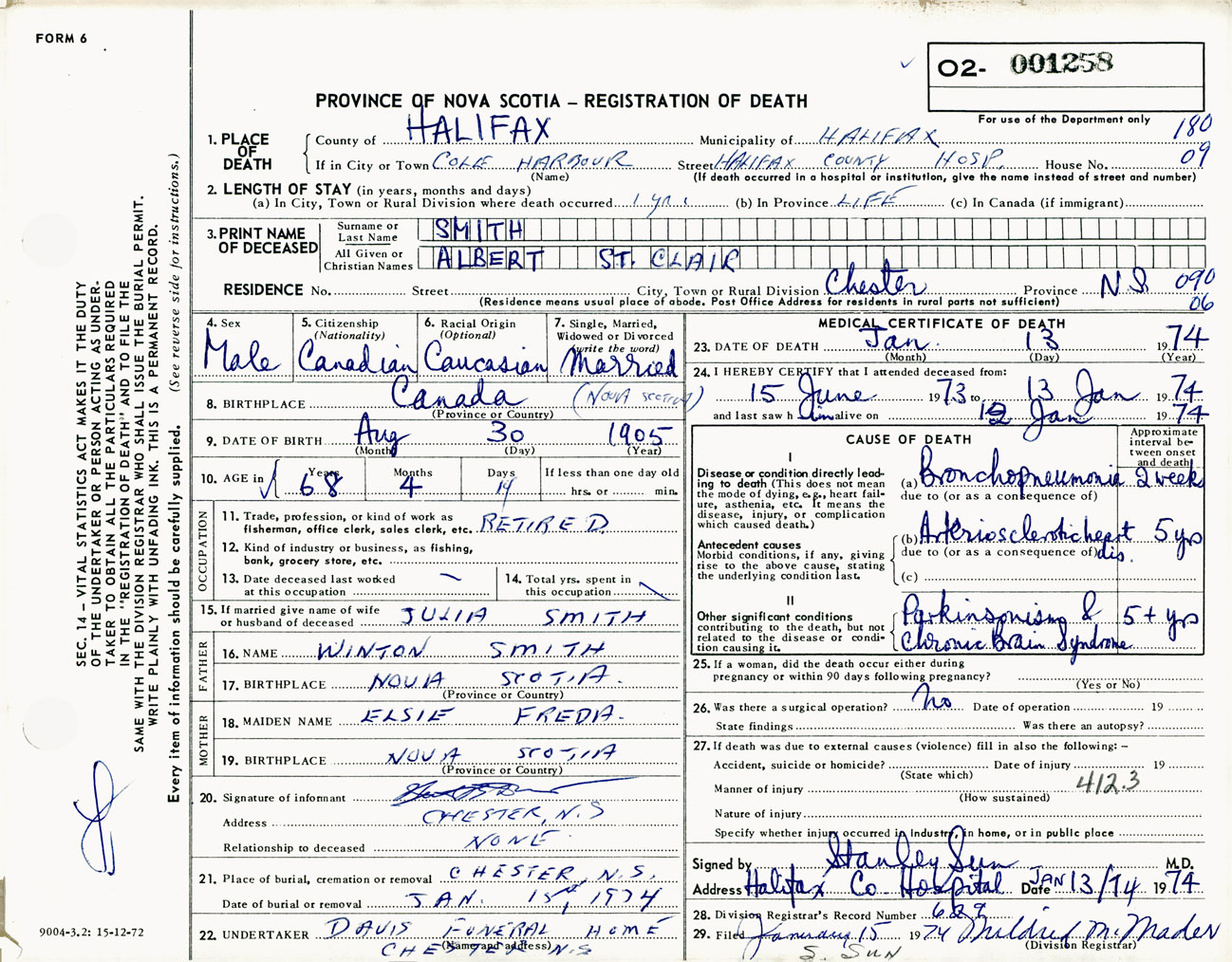 Male Death Registration: Year: 1974 number: 1258