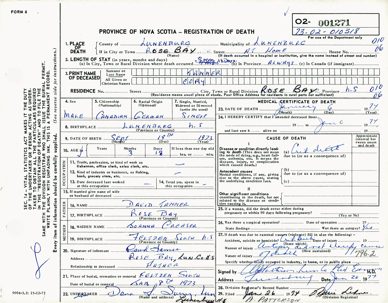 Male Death Registration: Year: 1974 number: 1271