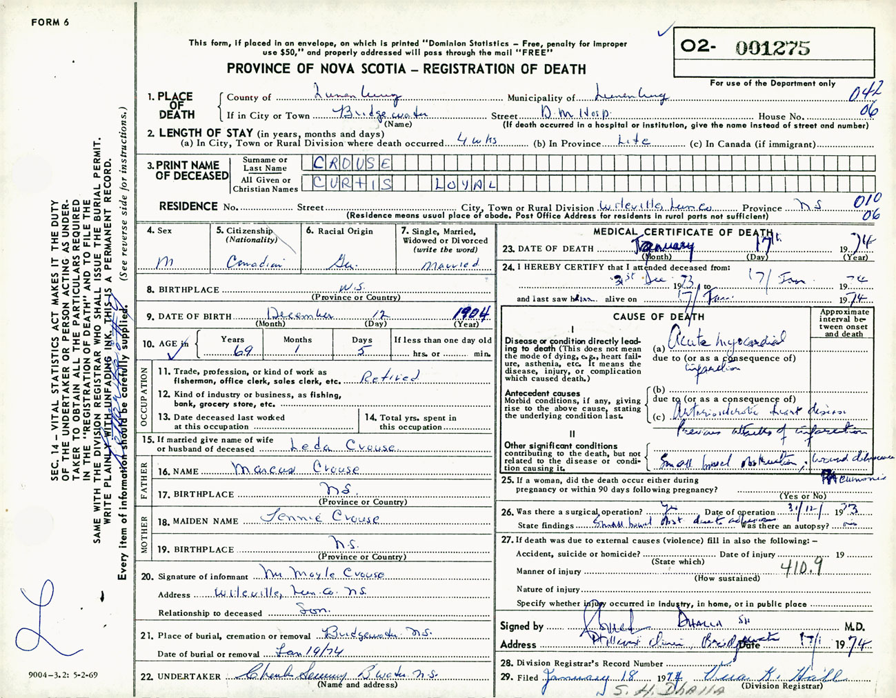 Male Death Registration: Year: 1974 number: 1275