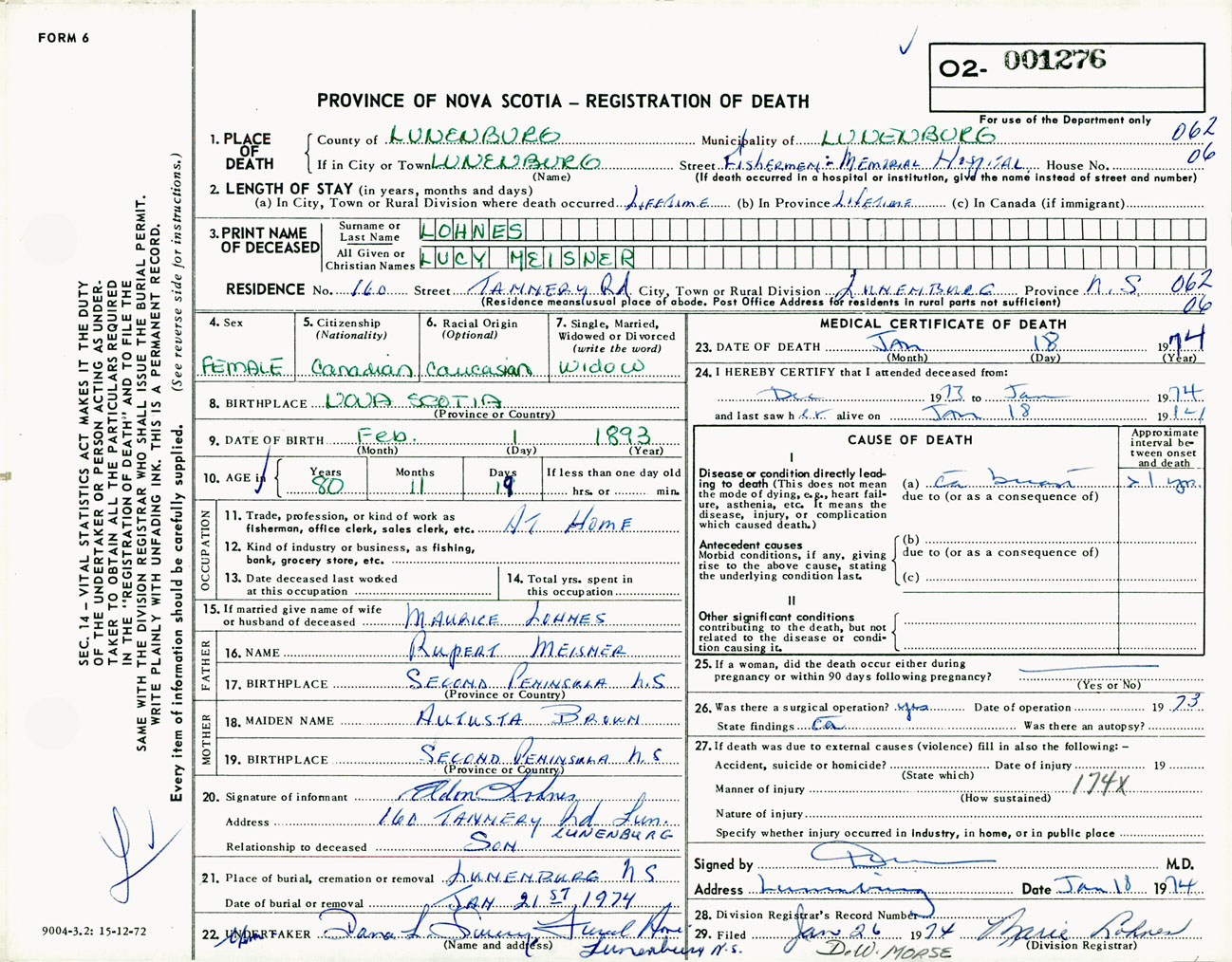 Female Death Registration: Year: 1974 number: 1276