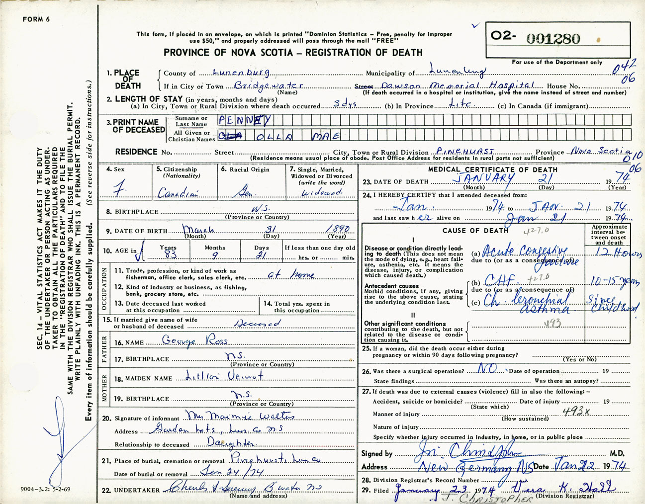 Female Death Registration: Year: 1974 number: 1280