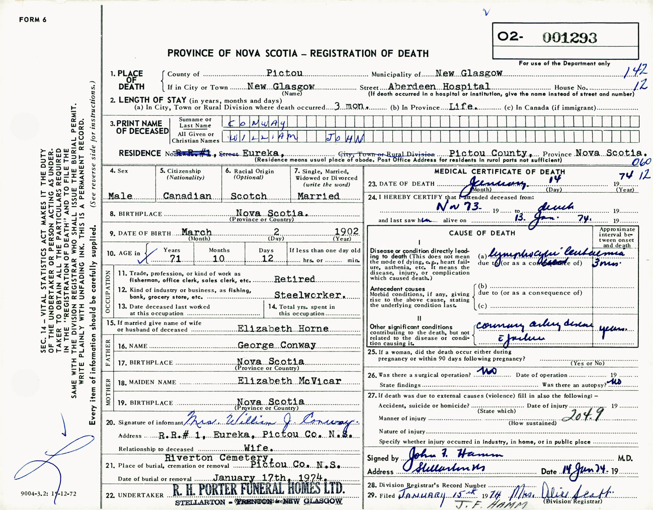 Male Death Registration: Year: 1974 number: 1293