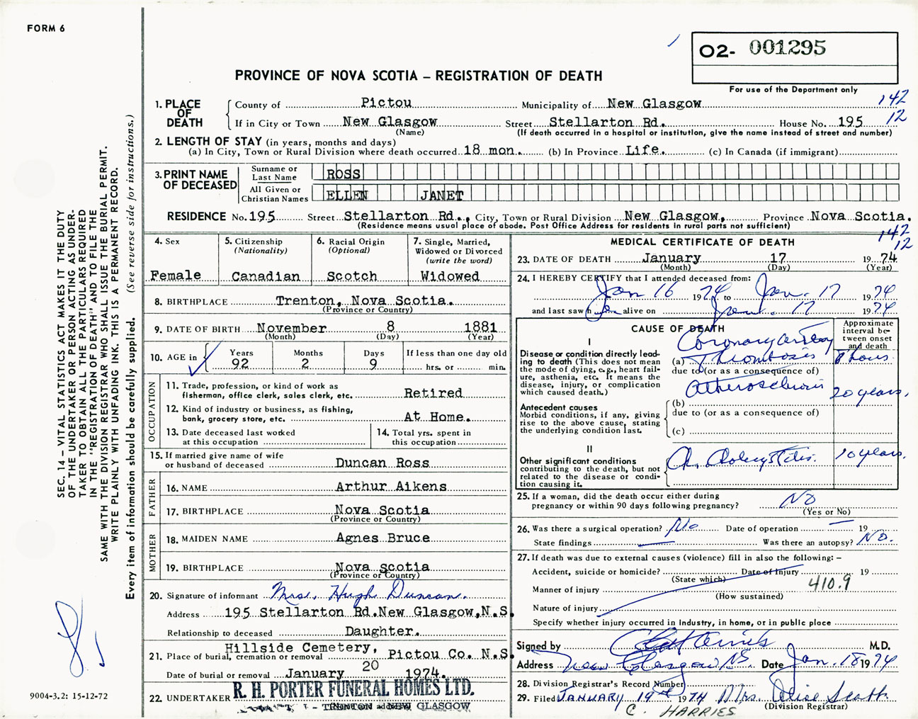 Female Death Registration: Year: 1974 number: 1295