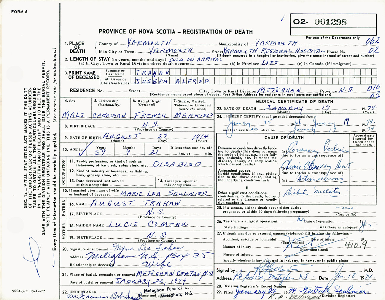 Male Death Registration: Year: 1974 number: 1298