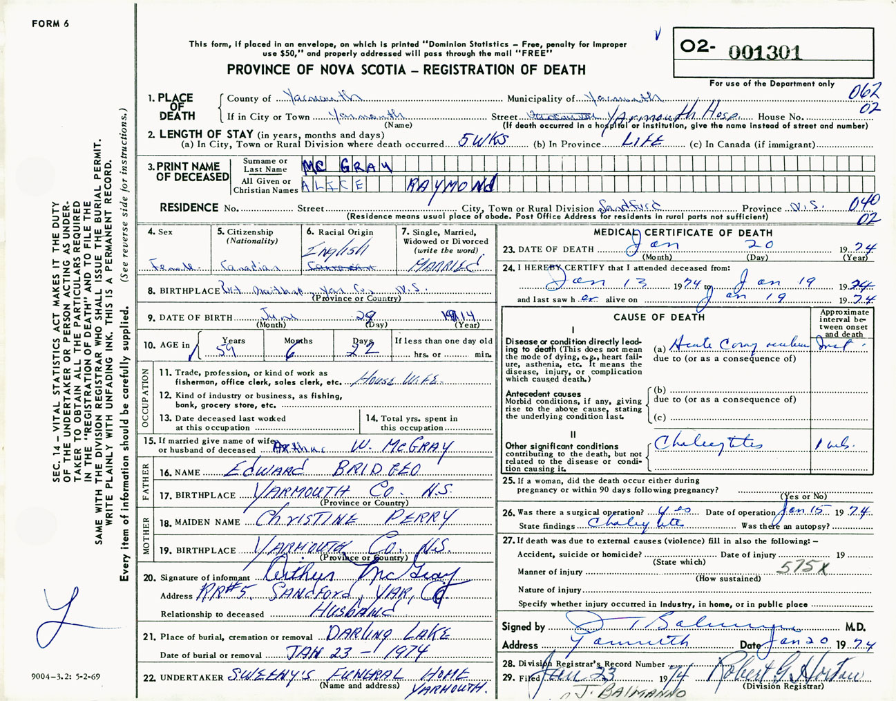 Female Death Registration: Year: 1974 number: 1301