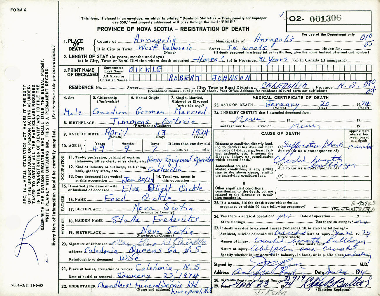 Male Death Registration: Year: 1974 number: 1306