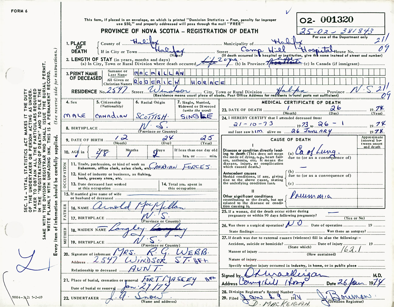 Male Death Registration: Year: 1974 number: 1320