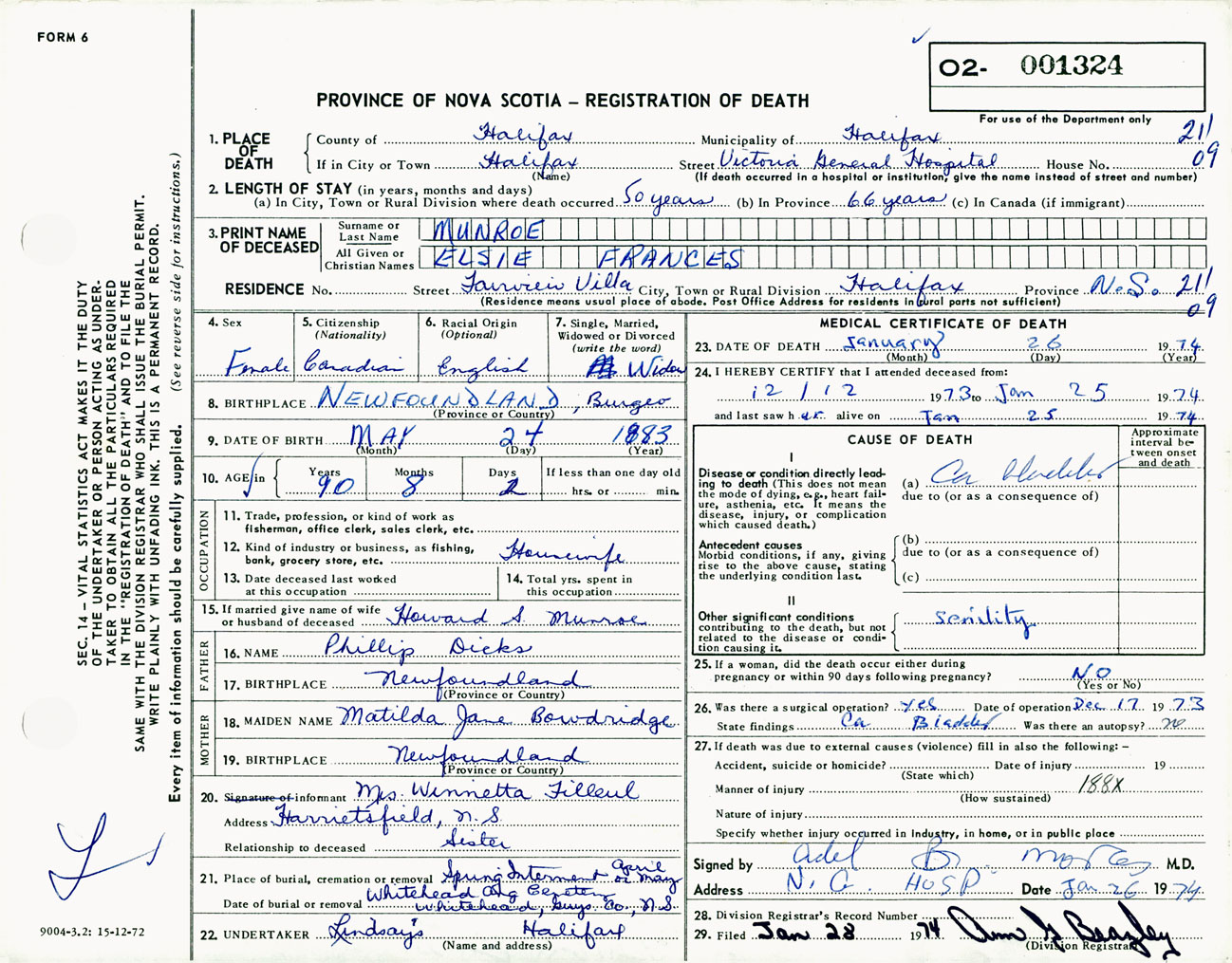 Female Death Registration: Year: 1974 number: 1324