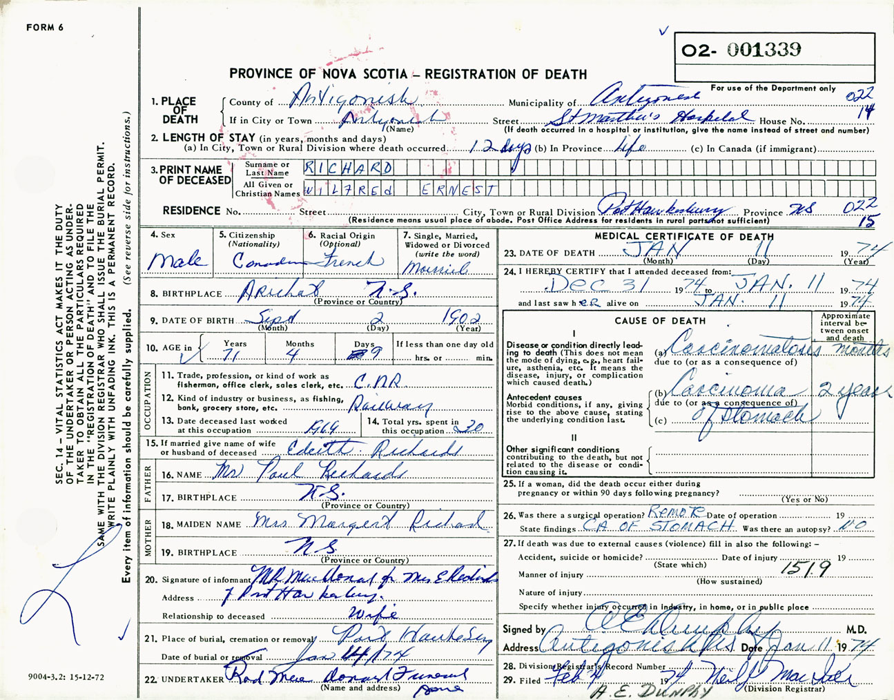 Male Death Registration: Year: 1974 number: 1339