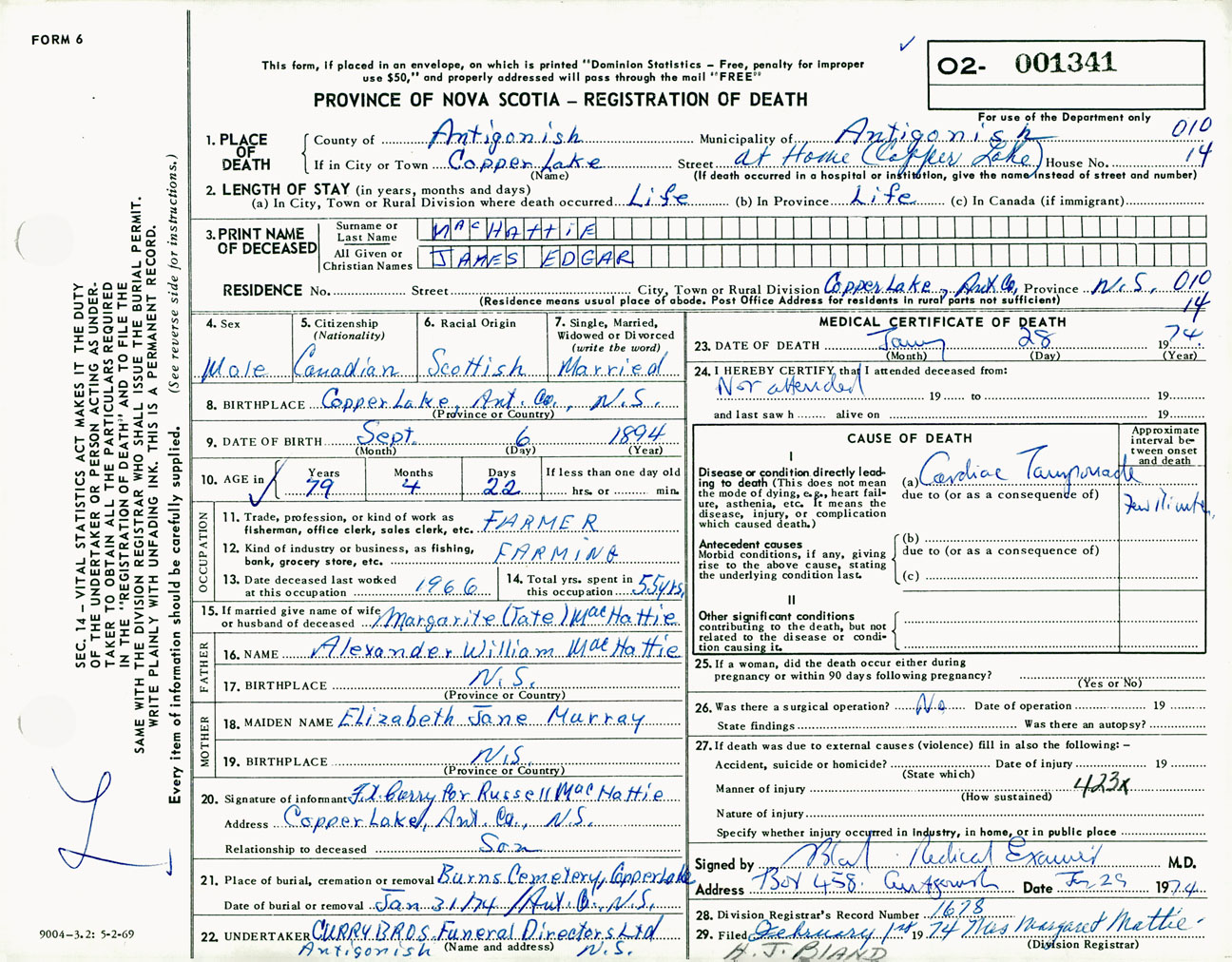 Male Death Registration: Year: 1974 number: 1341