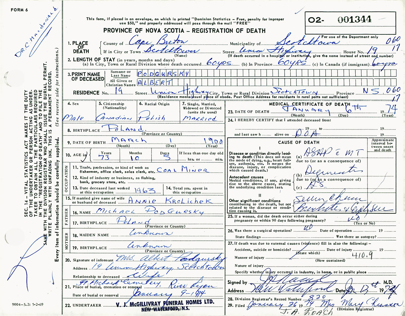 Male Death Registration: Year: 1974 number: 1344
