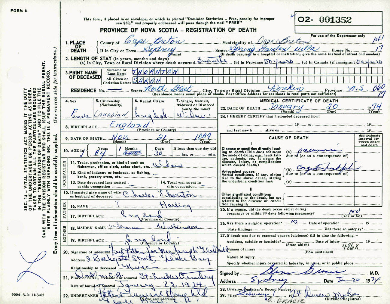 Female Death Registration: Year: 1974 number: 1352
