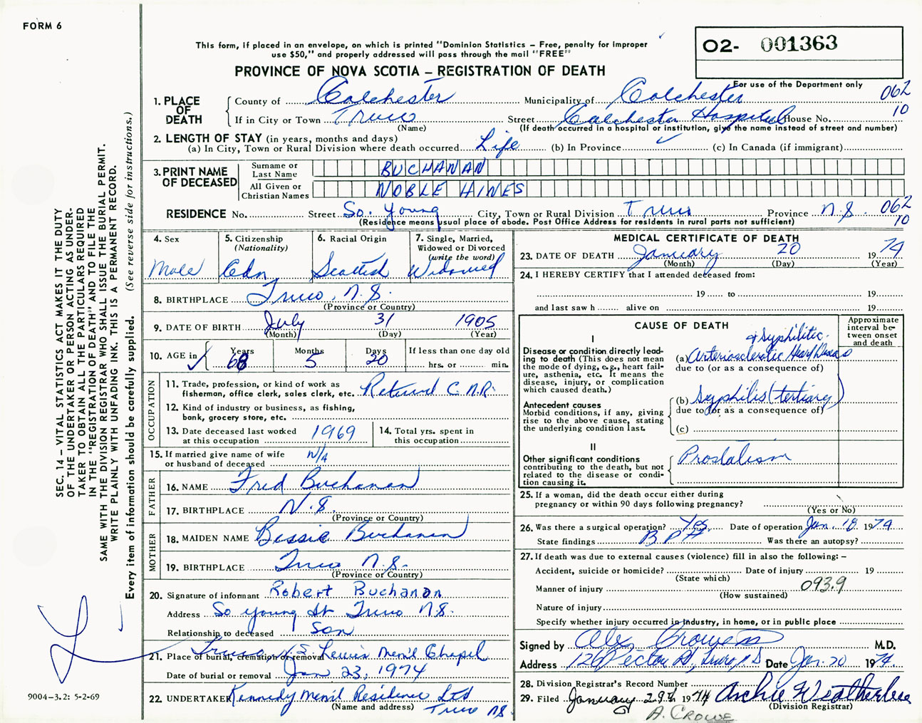Male Death Registration: Year: 1974 number: 1363