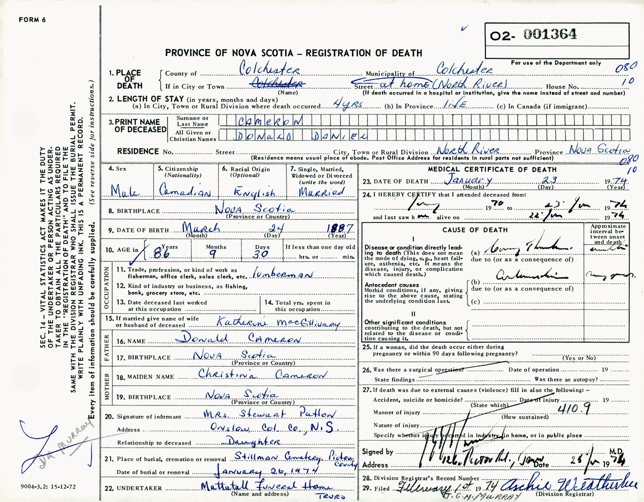 Male Death Registration: Year: 1974 number: 1364