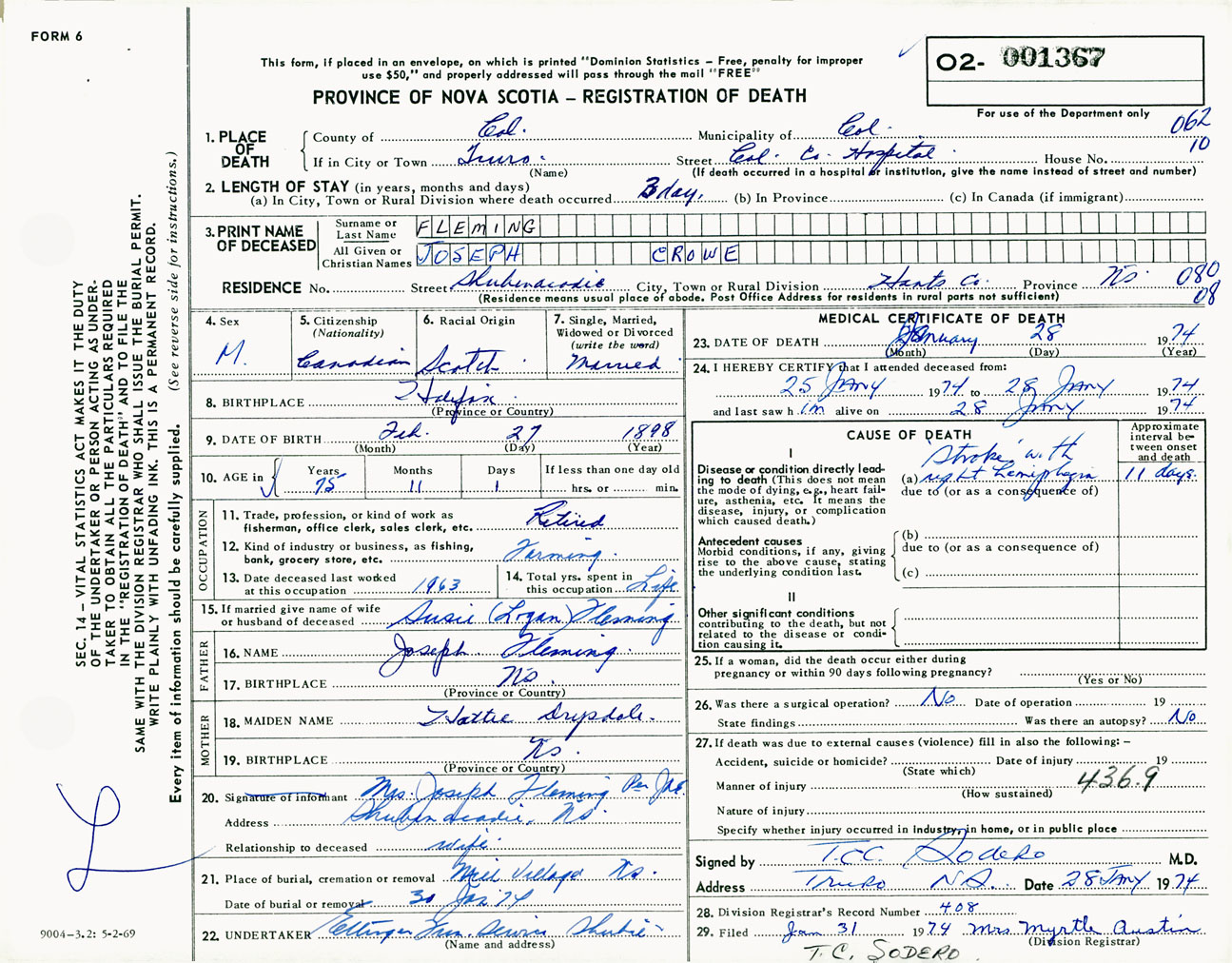 Male Death Registration: Year: 1974 number: 1367