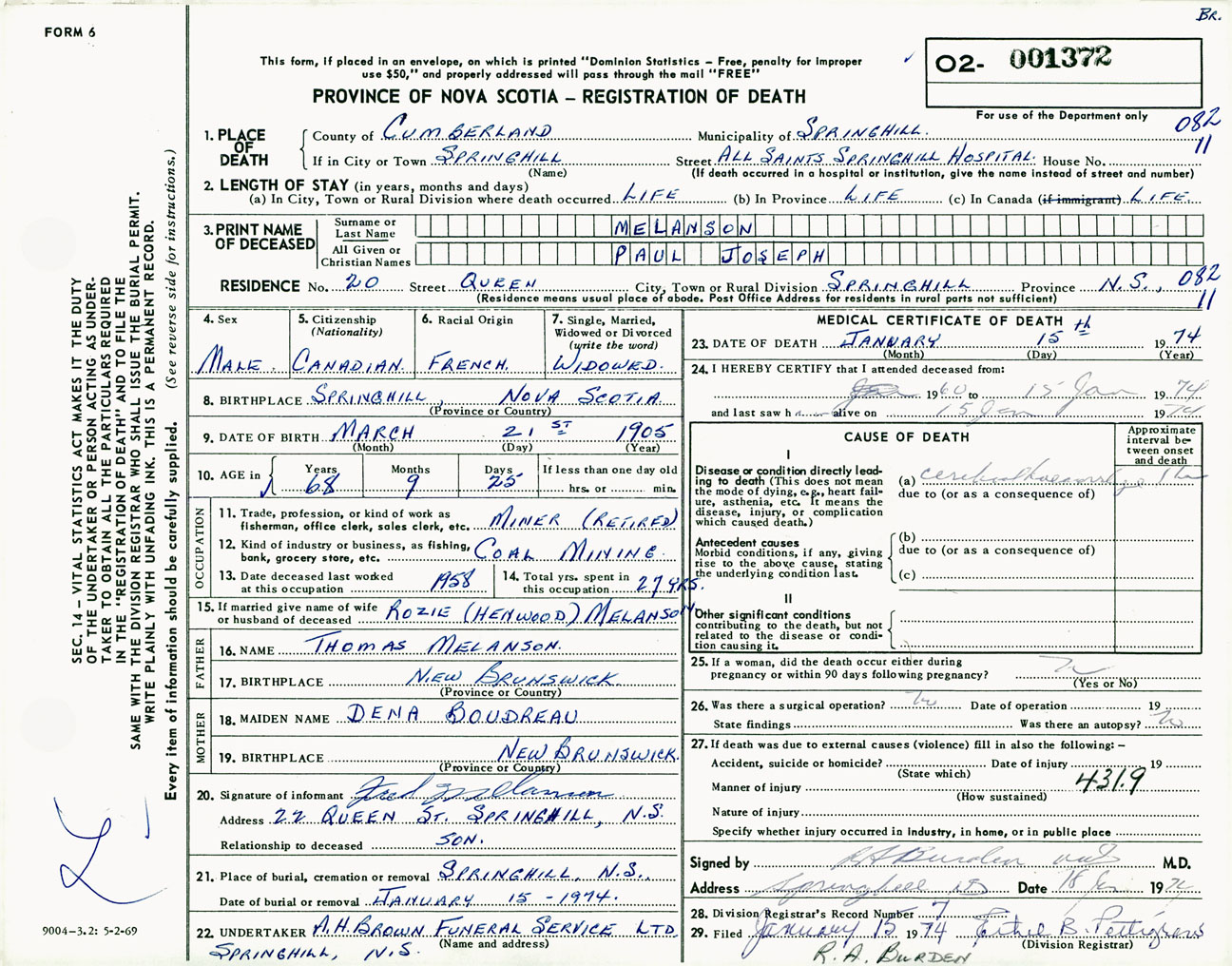 Male Death Registration: Year: 1974 number: 1372