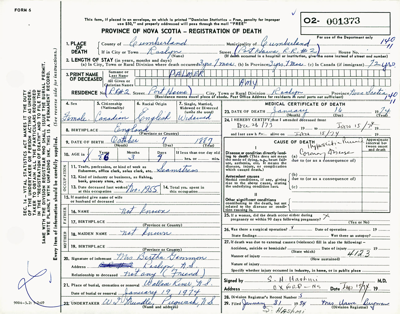 Female Death Registration: Year: 1974 number: 1373