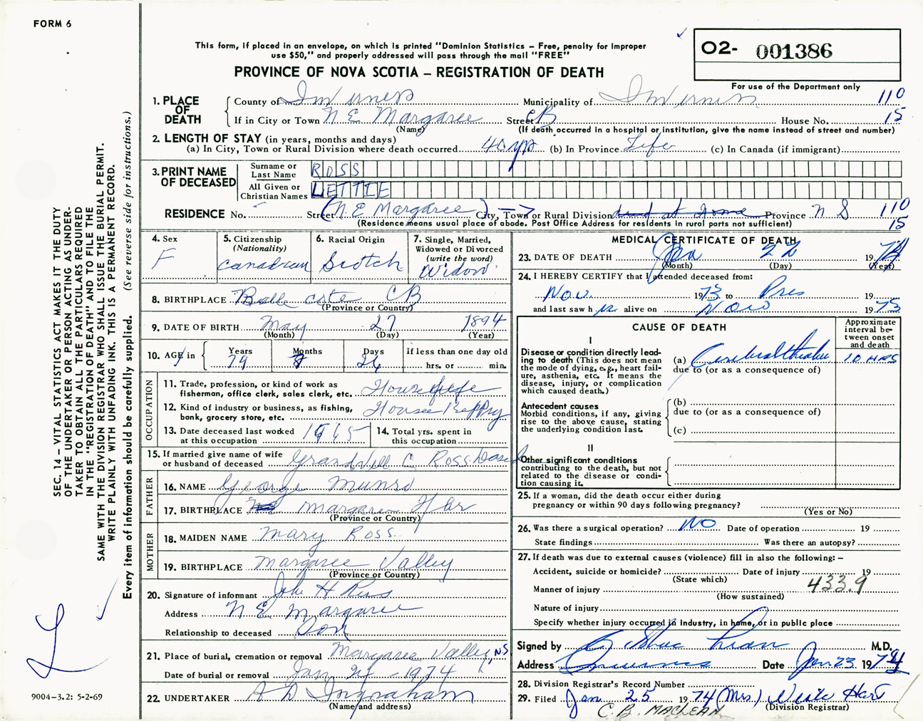 Female Death Registration: Year: 1974 number: 1386